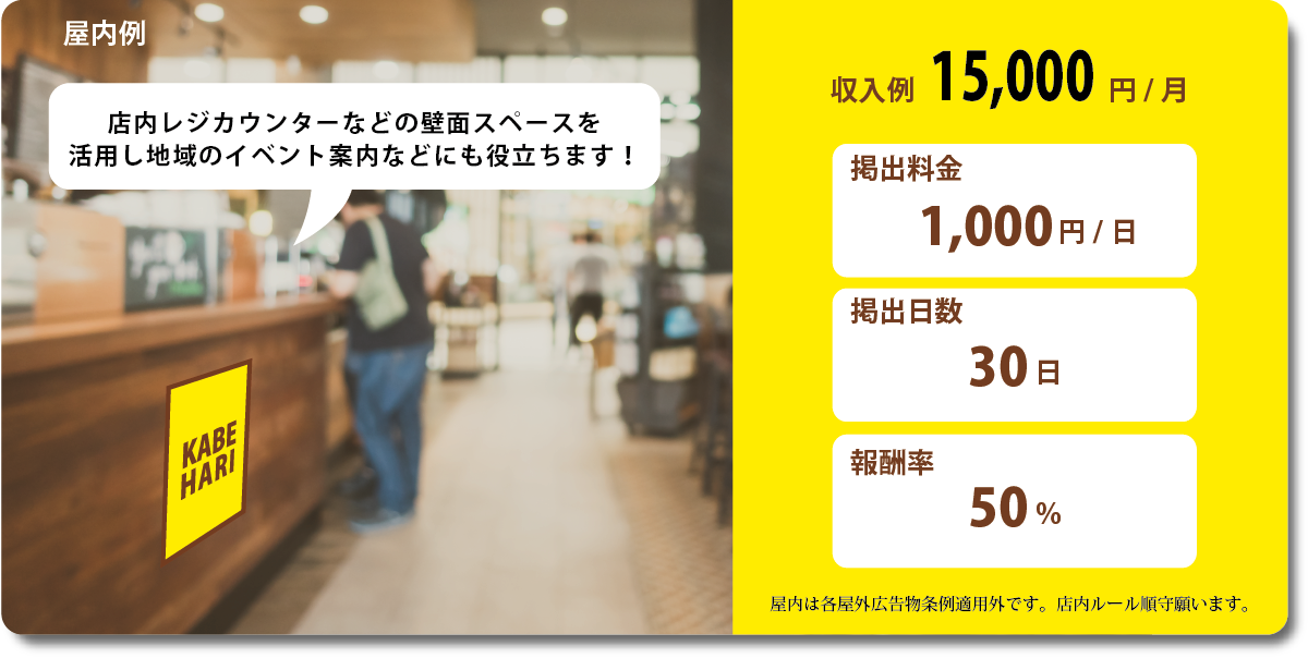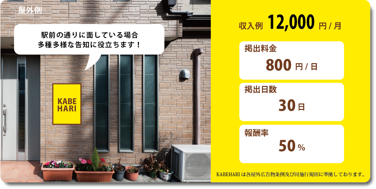 KABEHARIなら簡単に壁面スペースを収益化することができます。 もちろん、登録・掲載料は無料で、設備も不要。